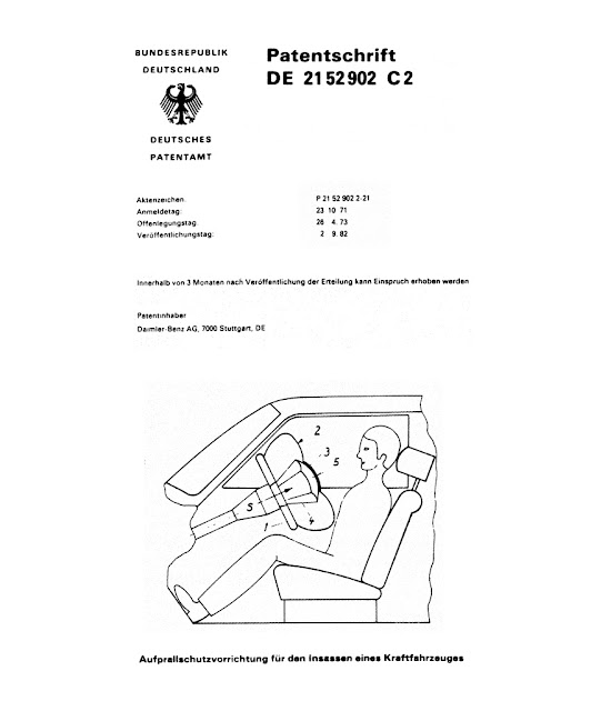 The invention: The basic idea for the airbag was attributed, amongst others, to the hobby inventor, Walter Linderer. In the 1950s, he had designed what he described as an “inflatable container in a folded state, which automatically inflates in the event of danger”. On 6 October 1951, the Munich-born inventor filed for a patent for his “device to protect persons in vehicles against injury in the event of collisions” from the German Patent Office. Although in his application Linderer precisely described the principle of an airbag, the technical requirements for the sensors as well as those for rapid gas generation simply did not exist in those days. Conventional compressed air was not suitable for generating pressure because it took far too long to inflate the airbag. The elastic and extremely tear-resistant material required to make the airbag was also not available at the time. This remained the case for some years. Mercedes-Benz returned to the idea of the airbag in 1966 and started the initial trials for effective gas generation in 1967. The patent for an “impact protection device for vehicle occupants” (Patent No: DE 21 52 902 C2) was filed by the then Daimler-Benz AG in October 1971.